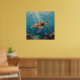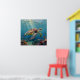 A sea turtle themed wall art with an illustration of a sea turtle under a calm teal sea swimming among the coral on the ocean floor with sun rays beaming down on him through the aqua water.