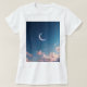A serene and peaceful landscape with a crescent moon floating against a bright sky adorned with fluffy clouds.