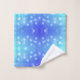 A set of vibrant blue and turquoise towels with a white polka dot pattern on a rack, conveying a fresh, calming tone. Includes large towel, hand towel, and washcloth.