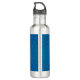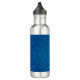 A silver stainless steel water bottle with a sleek design, featuring a dark blue band adorned with lighter blue polka dots. It has a black, textured screw cap handle.