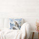 A pretty wildlife throw pillow with an illustration of a majestic snow leopard perched on a craggy, snow-covered peak, gazing out at a vast, frozen mountain range.