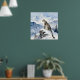A pretty wildlife wall art poster with an illustration of a majestic snow leopard perched on a craggy, snow-covered peak, gazing out at a vast, frozen mountain range.