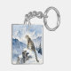 A pretty wildlife Keychain with an illustration of a majestic snow leopard perched on a craggy, snow-covered peak, gazing out at a vast, frozen mountain range.