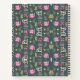 A spiral-bound notebook with a festive pattern featuring pink mittens, hot chocolate cups, and golden snowflakes on a dark green background, conveying a cozy winter theme.