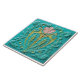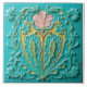 A square tile with a raised floral design in shades of blue, yellow, pink, and gold. The background is a solid turquoise blue. The central design features two large, stylized leaves in a teal color with gold accents, flanking a pink flower with a gold center. The leaves are set against a yellow shield-shaped backdrop.