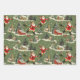 These three wrapping papers share a cohesive, vintage Christmas aesthetic, utilizing a classic color palette of deep reds, greens, cream, and touches of gold. The first design uses a soft, sage-green background with a wintry village scene, showcasing repeating images of a running Santa Claus, snow-covered houses, and evergreen trees The second design features an energetic, repeating pattern of retro-style elves dancing on a snowy landscape against a bright red background scattered with stars. The final design is a dense, repeating pattern of Christmas tree branches covered in snow or flocking, richly decorated with traditional red, green, and gold glass ornaments, and interspersed with "Merry Christmas" labels framed in red.