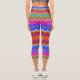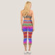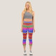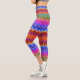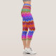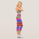 A woman wears vibrant, zigzag-patterned leggings in bold colors like magenta, blue, and orange. The lively design contrasts with her gray sneakers.