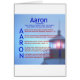 Unter Verwendung der Bedeutung des Namens Aaron ("Light Bringer"), dieses akrobatische Gedicht enthält eine Ermutigung oder Segen Scripture Vers, die mit jedem Buchstaben im Namen beginnt. Das akrobatische Segen Gedicht "Aaron" enthält Verse aus Isaiah, Sprichwörtern, 2 Thessaloniker und den Psalmen.