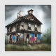 Ein unheimliches verfallenes altes Haus mit Spritzschmerzgraffiti. postapokalyptisch,