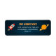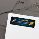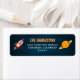 Niedliche Rücksendeadressen-Aufkleber im Weltraum sind mit orangefarbenen und weißen Schriftzeichen auf marineblarem Nachthimmel-Hintergrund mit einem Raketenschiff und einem umklingelten Planeten versehen. Entworfen, um sich mit unserer Geburtstagskollektion von Blast Off abzustimmen.