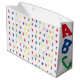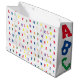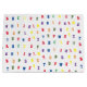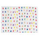 Das Alphabet ist gemustert in hellen, farbigen Schablonensätzen auf weißem Hintergrund. Die Buchstaben "ABC" werden seitlich größer angezeigt. Konzipiert zur Koordination mit der "ABC Baby Shower Collection".