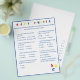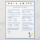 Das Design weist einen weißen Hintergrund auf einen blauen Rahmen und einen blauen Text auf. Titel wird in hellen Farben angezeigt. Fragen sind vielfältige Auswahlmöglichkeiten und beziehen sich auf die Entwicklung von Baby. Die letzte Frage ist jedoch anpassbar und ist der Mommy-to-Be personalisiert. Die Buchstaben "ABC" werden unten in der rechten Ecke in Primärfarben angezeigt. Antworten finden Sie auf der Rückseite. Auch in rot erhältlich. Konzipiert zur Koordination mit der "ABC Baby Shower Collection".