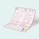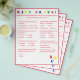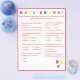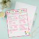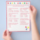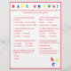 Das Design weist einen weißen Hintergrund auf einen roten Rahmen und einen roten Text. Titel wird in hellen Farben angezeigt. Fragen sind vielfältige Auswahlmöglichkeiten und beziehen sich auf die Entwicklung von Baby. Die letzte Frage ist jedoch anpassbar und ist der Mommy-to-Be personalisiert. Die Buchstaben "ABC" werden unten in der rechten Ecke in Primärfarben angezeigt. Antworten finden Sie auf der Rückseite. Konzipiert zur Koordination mit der "ABC Baby Shower Collection". Auch in blau erhältlich.
