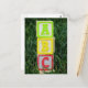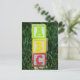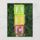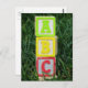 Grüne, gelbe und rote ABC-Blöcke, die im Gras stehend sind.