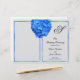 Blauer, gefalteter Programmüberzug für eine Hochzeitsfeier. Hübsche, große, blaue Hydrangea-Blume auf der Vorderseite mit schwarzem Text, der oben ein großes Monogramm enthält. Die passenden blauen Rahmen umschließen den Text und die Rückseite des Programms. Das 8,5 x 11-Zoll-Papier verfügt über optionale Upgrades und wird nur auf einer Seite gedruckt, um es nach dem Kauf zu falten.