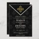 Elegantes und stilvolles Abend Chic Wedding Invitation Set auf einem gemusterten schwarzen Hintergrund mit einem goldenen Emblem.