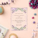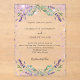 Eine Einladung für den Abend. Weiße, mit Lavendel-Blume, Eukalyptusgrün und lila Glitzern geschmückte Dekoration. Personalisieren und Ihre Namen und Details.