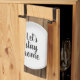 Weiße Tafel mit Silberbesteck auf Eichenholzboden und "lasst uns Zuhause bleibe" Text. Text ist bearbeitbar.