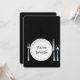 Weiße Tafel mit Silberbesteck auf schwarz zum Party einladen. Hintergrund kann bearbeitet werden.