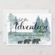 Abenteuer erwartet, rustikales Wald gibt eine Schwangerschaftsankündigung, mit Wanderbärenfamilie und einem Aquarellwald in Grün und Blau. Rustikaler Holzstil.