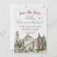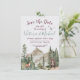 Das Abenteuer wartet auf das neue Paar! Charmantes und rustikales Aquarellwald Save the Date. Verfügt über einen Berghang mit Wald, Fuchs und Bär.Entsprechende Gegenstände auf diesem einen