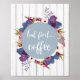 Aber zuerst Kaffee, Blume, blaues, rustikales Plak Poster