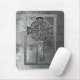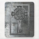 Abgenutztes altes Chrom, das keltisches Kreuz in einem keltischen Knoten-Feld schaut.