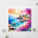 "Abgeschiedener Strand". Ein abseits gelegener Strand mit einem ruhigen blauen Meer ist von hübschen rosa und lila Blüten gerahmt. Ein ruhiger und entspannter Ort zum Nachdenken.