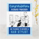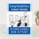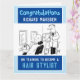 Herzlichen Glückwunsch an einen Friseur-Stylist, der seine Friseurausbildung abgeschlossen hat. Ein lustiger Cartoon zeichnend, der einen Friseur mit einem kahlen Gast zeigt. Herzlichen Glückwunsch für einen frisch qualifizierten Friseur, Friseur oder Friseur.