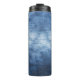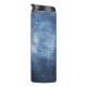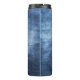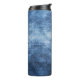 Abgetragener Denim-Stoff, texturierter Hintergrund Thermosbecher