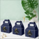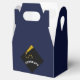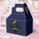 Einzigartige Graduierungsparty Gefallen Box Geschenke mit Glückwünschen Vorlage und schwarzen Graduierdeckel mit Goldkleckse auf marineblau Hintergrund.