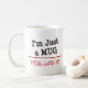 Textentwurfs-Sprichwort "ich bin gerade eine Tasse - BESCHÄFTIGEN Sie SIE!". Eine rote horizontale Linie teilt die zwei Teile, und sie sind auch Set im unterschiedlichen Schriftart und die Farben, zum oben zu erweichen.