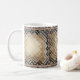 Dieses abstrakte, grafische Foto wurde in ein exotisches Monogramm-Design verwandelt, das einem türkischen Teppich ähnelt, der in leuchtenden Farben wie Taupe, Bronze, Bräune, Gelb, Weiß und Schwarz dargestellt wird.