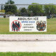 A huge anti-trump anti-ice political rally protest banner that says abolish ICE and bring back humanity, compassion and empathy in red, black and blue.