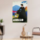 Dieses Vintage Werbeplakat ist für eine Region in Italien, Abruzzen. Das ist ein zeitgenössischeres Design, das in Blues, Rot und Schwarz gemacht wurde. Eine Frau steht im Vorfeld in schwarz gekleidet.