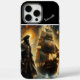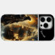 Ein einsamer Piratenkapitän blickt von einer hölzernen Plattform aus auf den Horizont, seine Augen reflektieren eine Mischung aus Traurigkeit und Entschlossenheit als ein majestätisches Schiff segelt in einen wirbelnden kosmischen Himmel hinter ihm