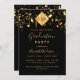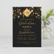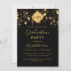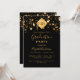 Eine elegante, einfache Einladungskarte für eine 2023 (oder jedes Jahr) Graduiertenparty für ihn und sie. Ein schwarzer Hintergrund und ein moderner abstrakter, schwarzer Tassel Topper in den Imitaten Gold mit dem Jahr innen. Dekoriert mit fallenden goldenen Sternen. Personalisieren und fügen Sie einen Namen und Party-Details hinzu. Der Text-Abschluss und der Name werden mit einem modernen Stilskript geschrieben. Golden farbiger Text. Zurück: Schwarzer Hintergrund und goldene Sterne.