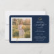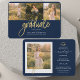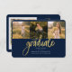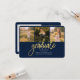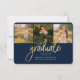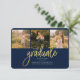 Abschluss 4 Foto Collage Script Blue Gold Announcement Karte. Passen Sie diese einfach an, indem Sie den Text ändern und die Fotos durch Ihren ersetzen. Eine moderne und trendiere Art, Ihren Abschluss in diesem Jahr bekannt zu geben!