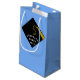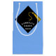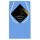 Abschluss Geschenktasche mit kreativem Schwarz-Gold-Cap-Design und Gratulationen auf einem hellblauen Hintergrund. Zum Anpassen editieren Sie Text, um den Namen Ihres bevorzugten Senior Class Grades hinzuzufügen.