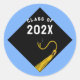 Klasse der '25 Abschluss Umschlag Aufkleber, Gastgeschenk-Etiketten und grad Geschenksticker mit schwarzer Kappe mit goldenen Tassel auf hellblauem Hintergrund. Text bearbeiten, um ihn zu personalisieren.