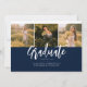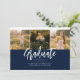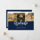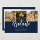 Abschluss 4 Foto Collage Script Navy Blue Script Announcement Karte. Passen Sie diese einfach an, indem Sie den Text ändern und die Fotos durch Ihren ersetzen. Eine moderne und trendiere Art, Ihren Abschluss in diesem Jahr bekannt zu geben!