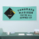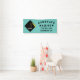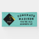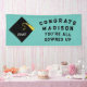 Creative High School oder Uni-Abschluß Glückwunsch Party Banner für Senior Class mit klassischer schwarz und goldfarbener Kappe auf aquamarinem blauen Hintergrund.