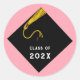 Rosa Abschluss-Umschlag Aufkleber, Geschenksticker oder Gastgeschenk-Etiketten mit schwarzer Graduierkappe mit goldfarbenem Tuch auf rosa Untergrund. Text bearbeiten, um das Senior Class Year hinzuzufügen.