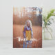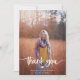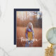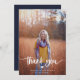 Chic weißes Typografie Foto Overlay, Abschluss danke Ihnen Karte. Merkmale, volles Foto auf der Vorderseite, Graduierungskappenakzent, runder Foto auf der Rückseite mit marineblau Hintergrundfarbe.