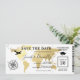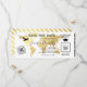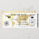 Abschluss Boarding Ticket Save the Date Einladung mit einer eleganten Goldfolie Ziel Weltkarte, Kompass, Flugzeug, Graduiertenkappe und eine personalisierte Textvorlage.