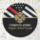 Dieses Design ist mit einer Feuerwehrflagge mit schwarz-weißen Streifen und einem dünnen roten Streifen versehen. "Glückwunsch" und das Abzeichen eines Feuerwehrmanns sitzen über dem Namen des geschlossen Feuerwehrmanns. Dieses Design eignet sich auch hervorragend für pensionierte Feuerwehrleute, Leutnants oder Häuptlinge. Feiern Sie stilvoll!