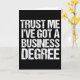 Vertrau mir, ich habe einen Abschluss in Wirtschaft got. Ein Abschluss Spaß Ausweis, um einem Absolventen zu gratulieren, der einen Master of Business Administration von einer Uni oder Universität. Ein lustiges Zitat von einem Geschäftsmann, einer Geschäftsfrau oder einem Geschäftsmann.