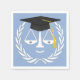 Creative Law School Graduation Party Servietten mit einzigartigen Maßstäben der Gerechtigkeit personifiziert mit einem schwarzen und goldenen Grade Mütze.