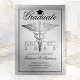 Schicken Sie Ihrer Familie und Ihren Freunden eine elegante Abschluss-Ankündigung für Ärzte. Dieses Design-Template verfügt über ein Imitat silbernen Hintergrund für ein caduceus mit dem Wort "Graduate" mit schwarzer Graduate-Kappe und Ihre Abschluss-Details für Sie zu personalisieren. Designed by artist ©Tim Coffey.
