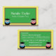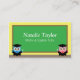 Get bemerkte mit dieser entzückenden und bunten Visitenkarte! Es kennzeichnet ein Paar niedliche Eulen, rosa und blau, die Mortarboards und Abschlussausstattungen mit Kreide in ihren Flügeln tragen, die vor einem grünen Kreidebrett stehend sind. Die Eule ist perfekt, weil sie Wissen und Klugheit symbolisiert. Rückseite schließen Raum für die Anzeige der Bescheinigungen und der Bildungsdetails ein. Eine passende Geschäftskarte für die grundlegende und Vorschullehrer, die Tutoren und jedermann in der Bildung und in den Academics bezog sich Geschäfte.